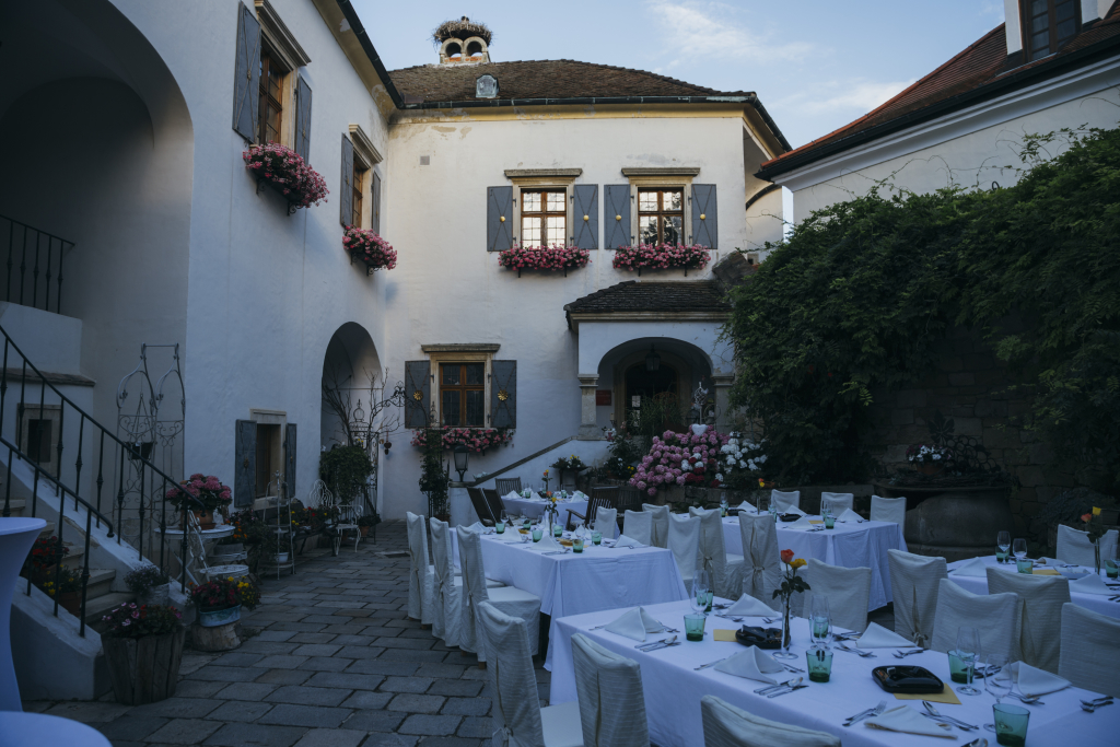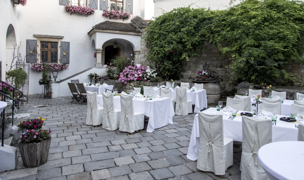 Der malerische Innenhof ist gesäumt von weiteren Nebengebäuden, wie dem Kaminstübchen, und lädt zum Verweilen ein.